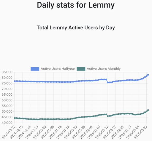 arrow-up11arrow-down1imageThere's a clear up tick on daily users growing and we've crossed the 50k line as of yesterday! LETSSS GOOO!lemmy.worldcm0002@lemmy.worldEnglish · 8 months agomessage-square0linkfedilink