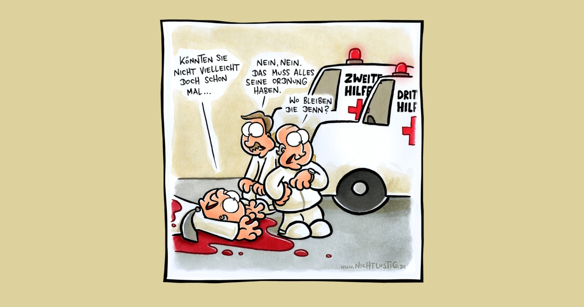 Da gibts ein Nicht Lustig Witzbild zu wo der Zweite Hilfe und Dritte Hilfe Rettungswagen auf die Erste Hilfe warten
