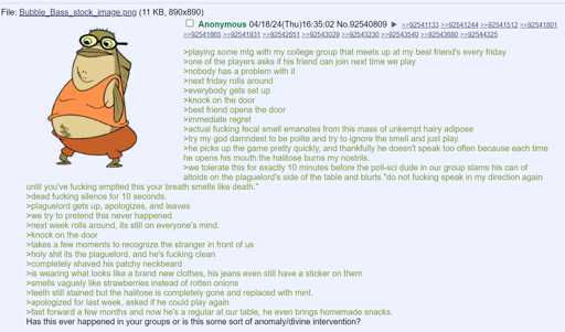 >we tolerate this for exactly 10 minutes before the poli-sci dude in our group slams his can of altoids on the plaguelord's side of the table and blurts "do not fucking speak in my direction again until you've fucking emptied this your breath smells like death."