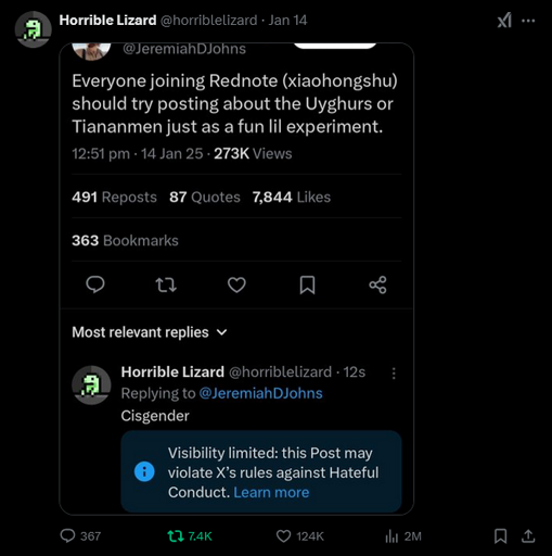 I am sure cisgender (顺性别) and other genders are at least shadow-banned on red note. Honestly, I have not heard this word for my entire Chinese-speaking life, until one of my LGBT friend mentioned it.