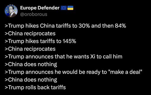 kingshrubb@lemmy.ml to Microblog Memes@lemmy.worldEnglish · 7 months agoTrump vs Chinalemmy.mlimagemessage-square0linkfedilinkarrow-up11arrow-down10